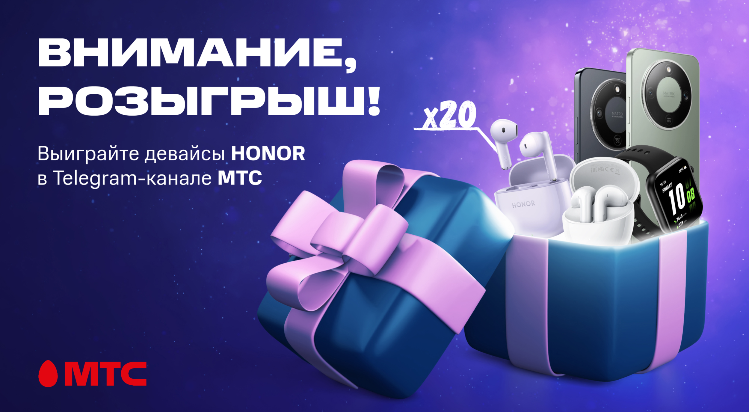 МТС объявил о старте нового розыгрыша в своем Telegram-канале. На этот раз в числе призов 24 девайса HONOR, включая смартфоны, наушники и смарт-часы.