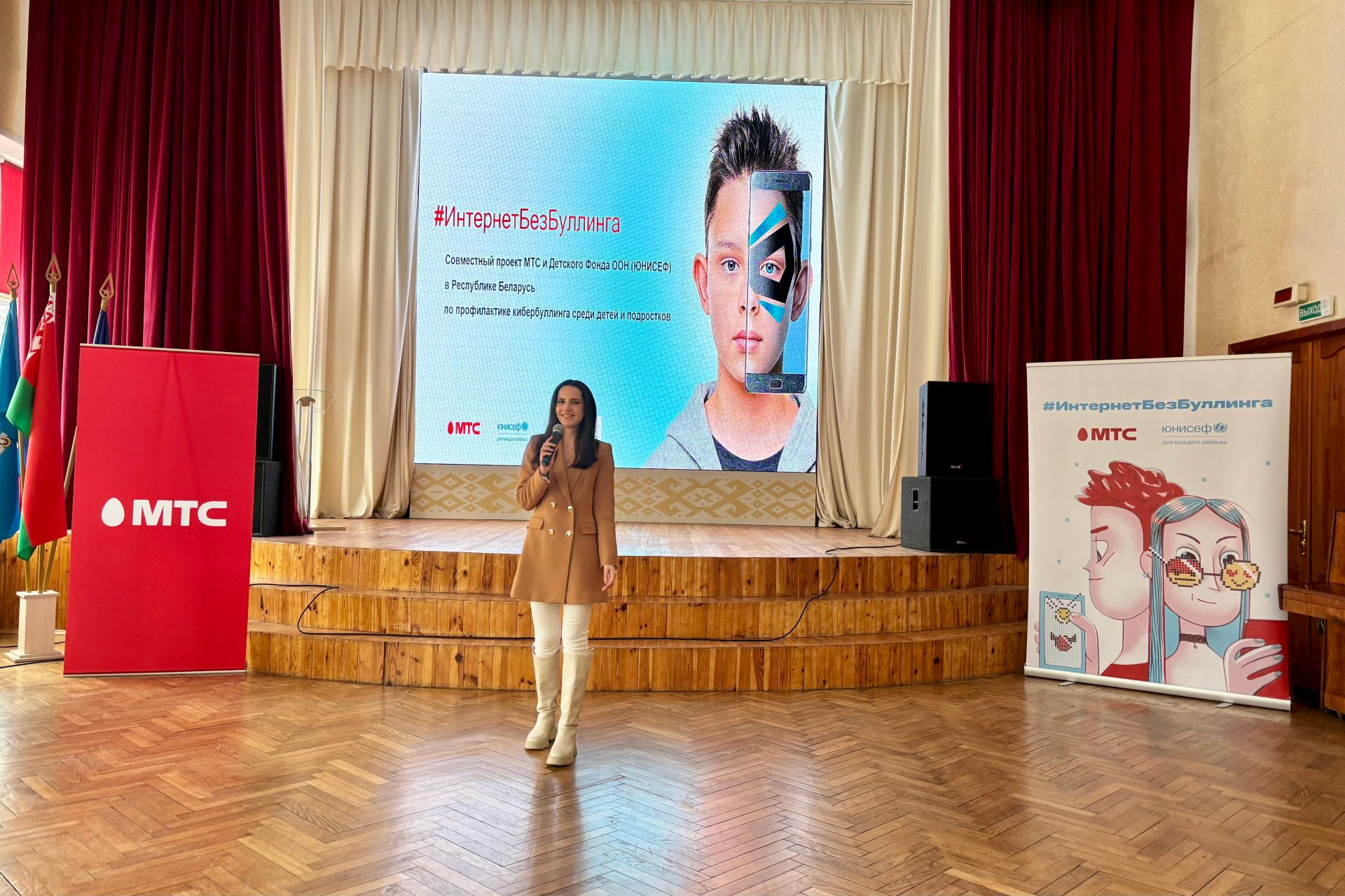 Социальная инициатива #ИнтернетБезБуллинга реализуется компанией МТС совместно с Министерством образования Республики Беларусь и Детским фондом ООН (ЮНИСЕФ) в Беларуси. Проект направлен на профилактику кибербуллинга и развитие навыков безопасного общения в сети. В рамках него уже созданы тесты-тренажеры, обучающие видео и TikTok-ролики, которые посмотрели миллионы пользователей. Также создан чат-бот для помощи родителям в защите детей от интернет-травли. Готовится к выпуску методическое пособие для проведения классных часов в школах.